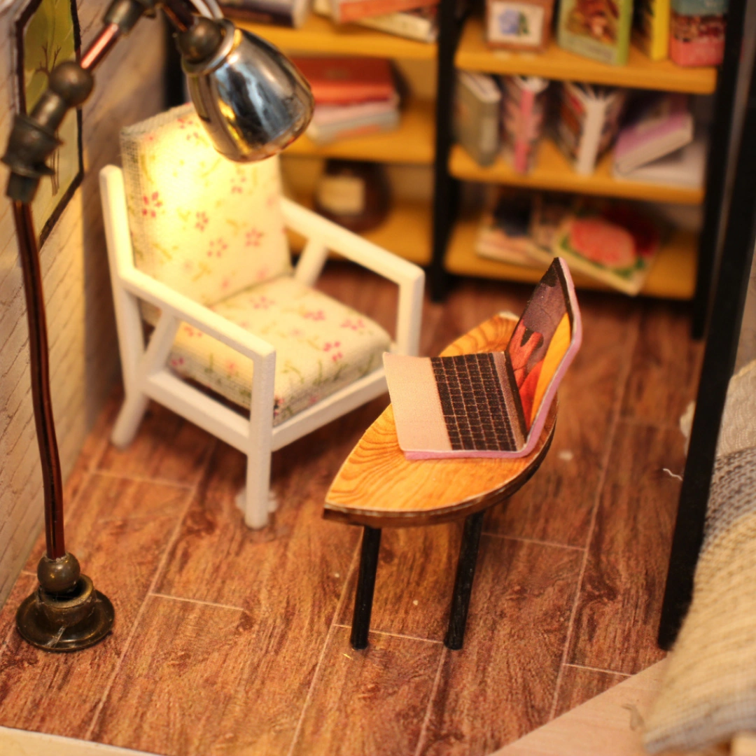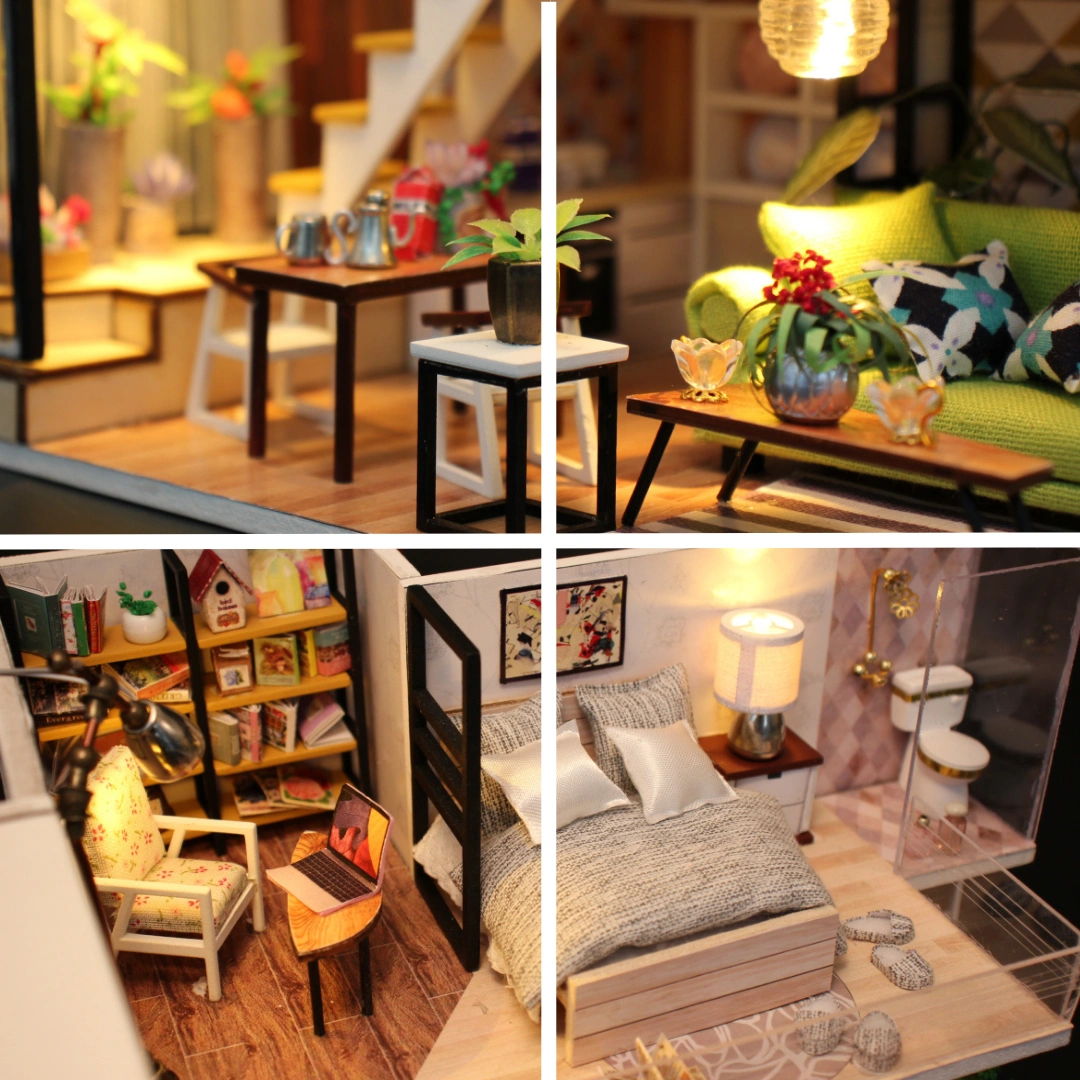 - Detaylı Minyatür Mobilya ve Aksesuarlar: Ahşap masa, kitaplık, yatak, koltuk, bitkiler gibi detaylarla zenginleştirilmiş bir loft evi.