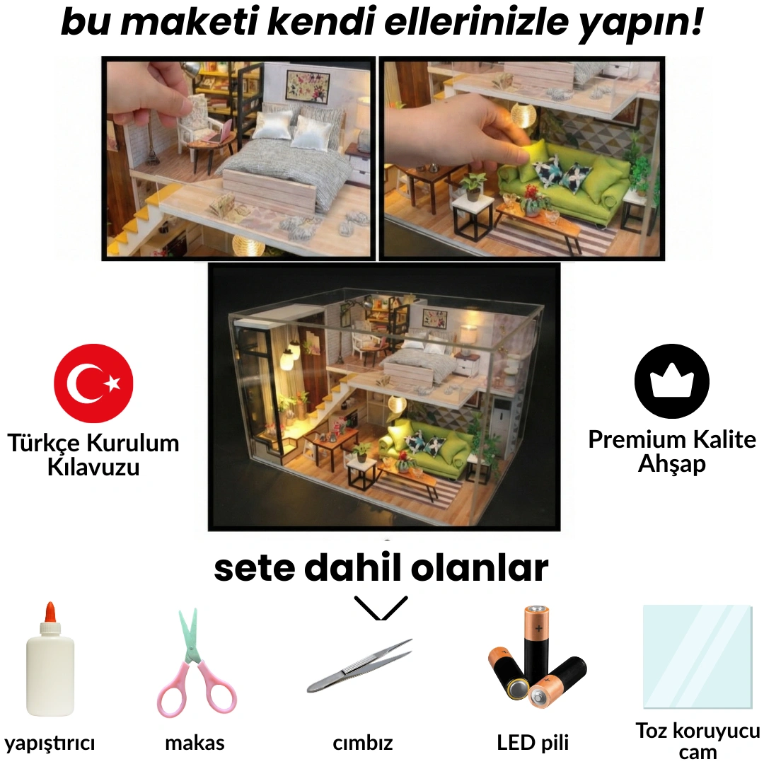 Modern Loft, sadece görsel bir dekor değil; aynı zamanda yaratıcı ellerinize hayat vereceğiniz bir kendin yap macerası! Ahşap mobilyalar, dekoratif aksesuarlar ve zarif dokunuşlarla dolu bu minyatür ev, adım adım sizi keyifli bir inşa sürecine davet ediyor. Hobi evini oluştururken her detayda kendi kişisel dokunuşunuzu katacak ve bitirdiğinizde evinizde sergileyeceğiniz bir sanat eseri yaratmış olacaksınız.