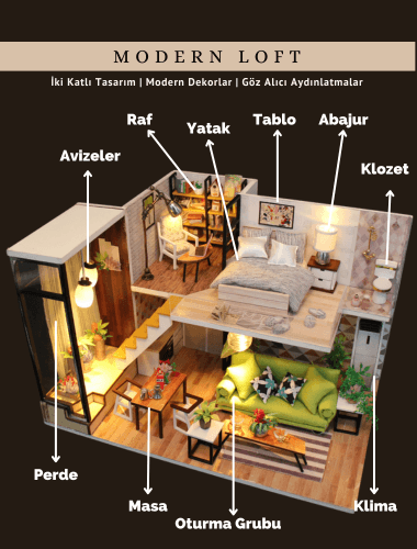 Şehir yaşamının modern dokusunu minyatür ev sanatıyla buluşturan Modern Loft, her detayıyla göz alıcı bir kendin yap (DIY) maket ev modelidir. Loft tarzı bu hobi evi, yaşam alanlarını ince detaylarla süsleyerek, şık ve modern bir atmosfer yaratıyor. Üst katında rahat bir yatak odası ve çalışma alanı, alt katında ise modern bir oturma odası ile dikkat çekiyor. Minyatür mobilyalar, dekoratif objeler ve LED ışıklandırma sistemi, evinize sıcaklık katarken hobi minyatür tutkunları için keyifli bir deneyim sunuyor.
